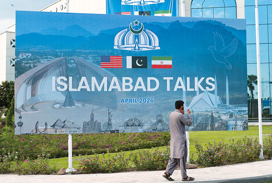 这是 2026 年 4 月 11 日在巴基斯坦首都伊斯兰堡拍摄的美伊谈判相关海报
