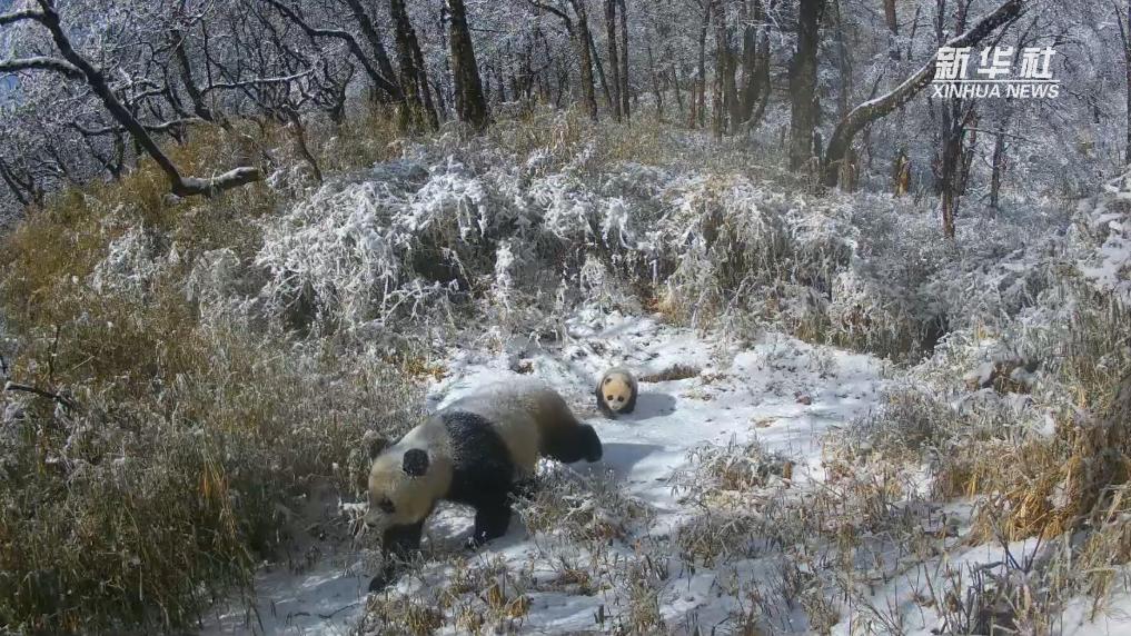 萌化了,成都野生熊猫母子雪中漫步