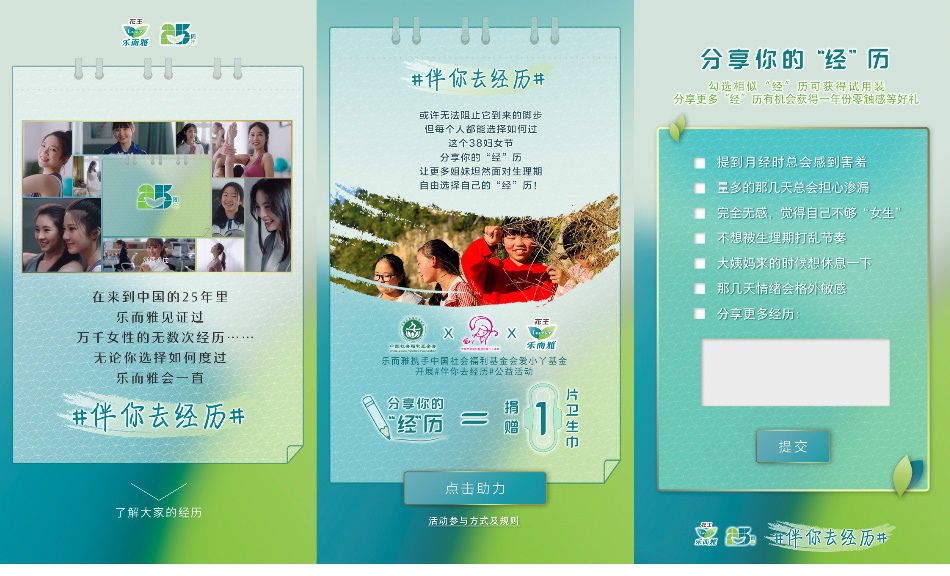 为了号召更多的消费者参与此次活动,同时传达“正视生理期,告别月经羞耻”的品牌态度,乐而雅制作了线上专题互动页,鼓励更多女性分享自己的经历,让更多人认识到月经只是女性正常生理周期的一部分,每个人的情况相同或不同,最重要的是要以自己舒服的方式度过。当消费者在互动页面上分享自己的生理期经历,或者购买乐而雅25周年限定套装产品,乐而雅就会捐赠一定数量的产品(*具体内容见互动页面)。在传递乐而雅“伴你去经历”品牌精神的同时,期待为更多女生带去贴心守护。