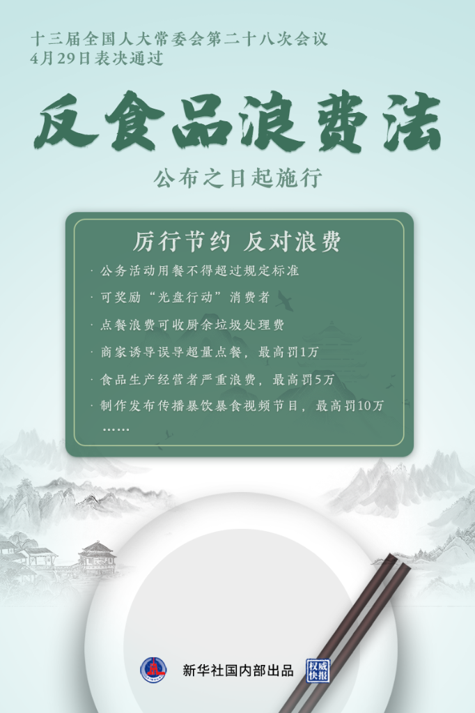 “反食品浪费法在全社会树立了浪费可耻、节约为荣的鲜明导向,一段时间以来,各地各部门纷纷作出具体明确规范并严格落实。”北京市农林科学院研究员赵晓燕说,人们的日常食品消费有了基本行为准则,制止餐饮浪费有了长效机制,政府监管有了强力支撑,以法治方式进行综合治理有了制度保障。