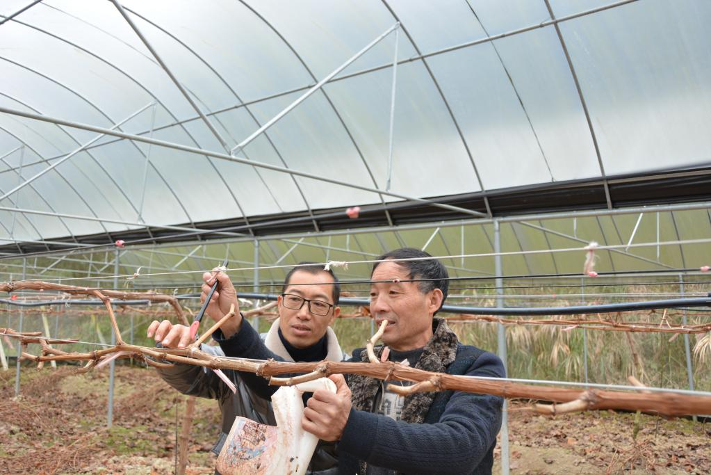 2月9日,南平市建阳区麻沙镇科技特派员姚长春在葡萄大棚里指导麻沙镇水南村村民刘贵道(右)点芽。 新华社记者张华迎 摄