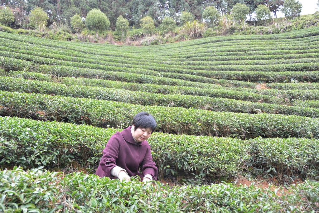 2月10日,武夷山市兴田镇西郊村村民游瑞娇在茶山上查看茶叶长势。 新华社记者张华迎 摄