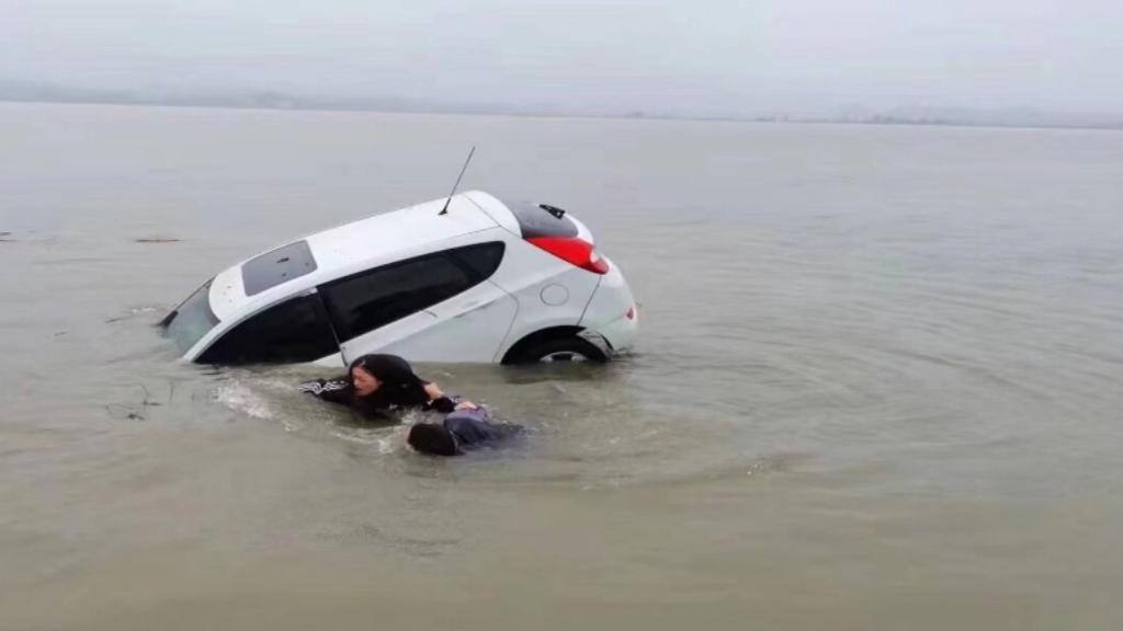 一辆轿车突遇事故冲入湖中