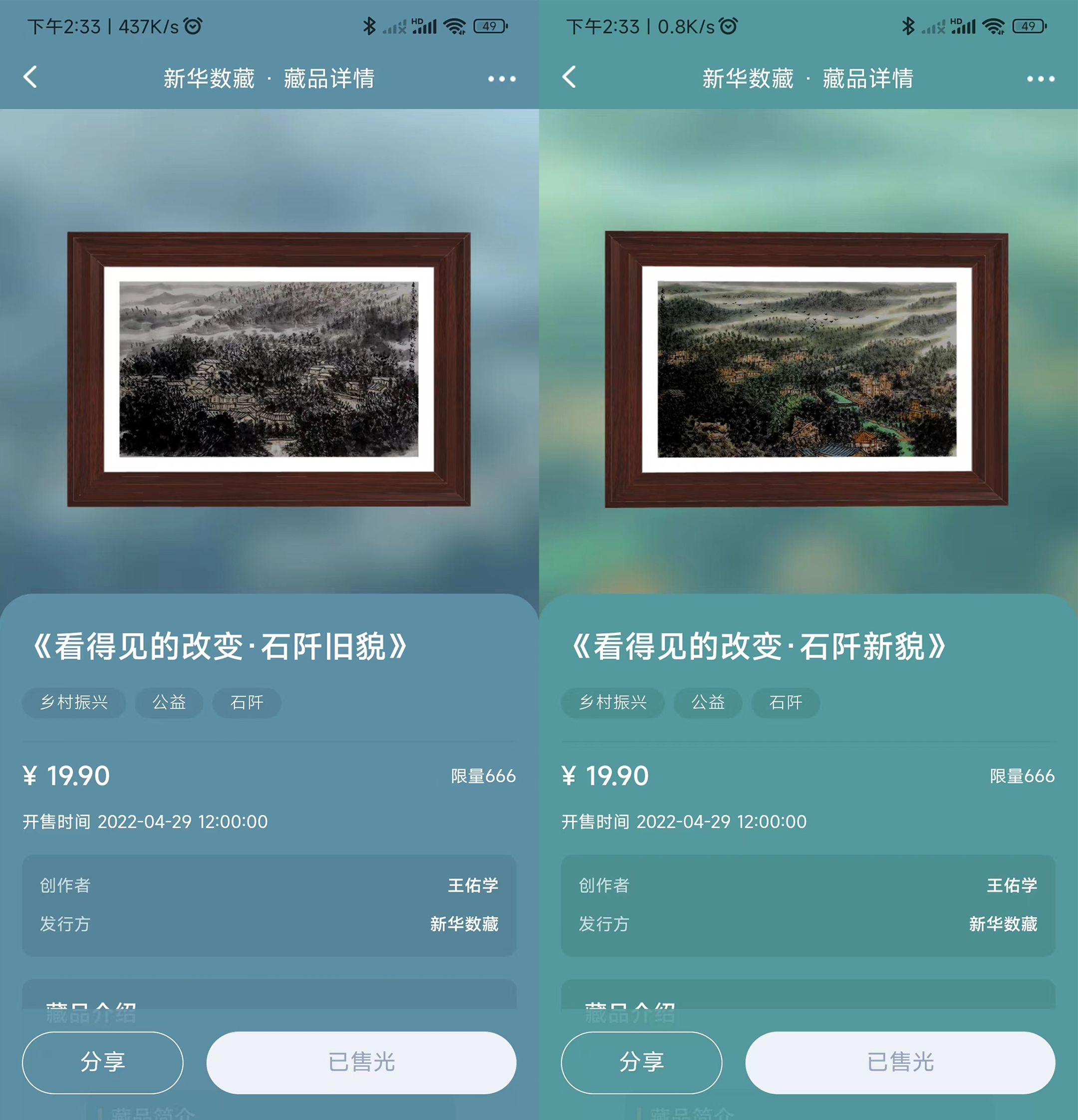 “乡村振兴·看得见的改变”系列公益数字藏品——《看得见的改变·石阡旧貌》《看得见的改变·石阡新貌》,由新华网邀请著名中国山水画家王佑学以新华社定点帮扶县贵州石阡变迁图景为基底进行艺术创作,是新华网进一步助力实施乡村振兴战略,将数字公益文化IP与区块链技术相结合的有力实践。