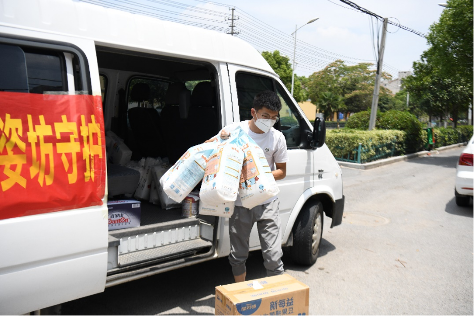 7月3日,在泗县桃李文苑小区,一母婴用品店的工作人员在为小区居民配送母婴用品。新华社记者黄博涵 摄