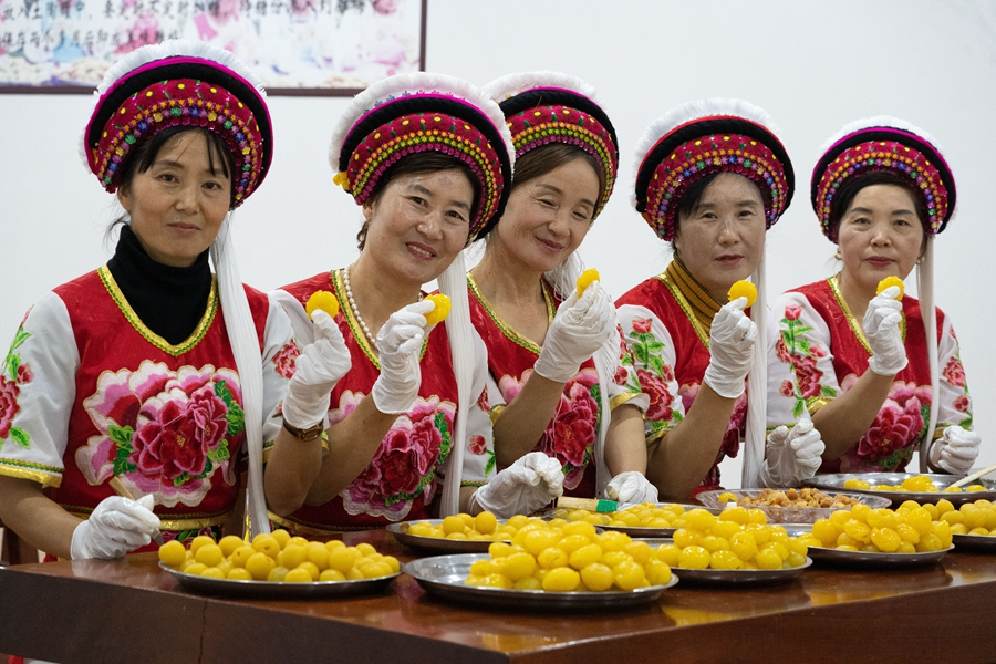 走进罗筛雄的梅果加工厂,乌梅烘烤区的工人们正忙着分选鲜梅,并把选好的梅子摆放到推车里,送入烘烤房进行烘干。另一边,工人们正手握小刀,快速地在梅子上雕刻着,不一会儿,一颗色泽金黄、形如菊花的雕梅就制作完成了。罗筛雄介绍,雕梅是大理传统特色美食,外形漂亮,口感酸甜脆嫩,深受本地人和游客的喜爱,工厂每年都要从收购的鲜梅中挑选出70到80吨个大色正、品质上乘的,加工成雕梅。
