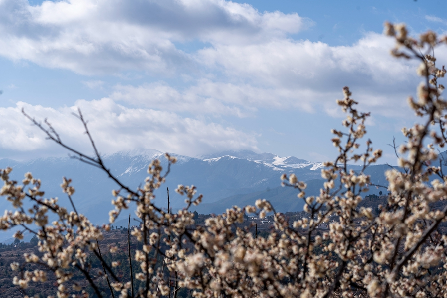 梅花与雪山“同框”(摄于2月8日)。新华网(罗新才/摄)