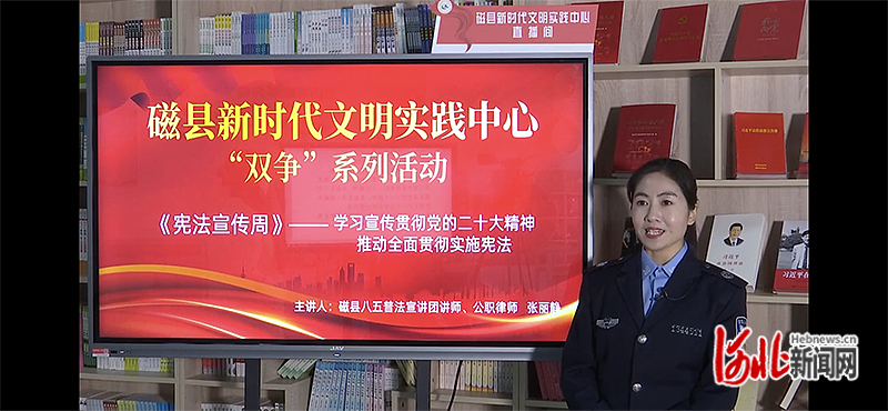 在磁县新时代文明实践中心,磁县司法局八五普法讲师团讲师、公职律师张丽静以“学习宣传贯彻党的二十大精神,推动全面贯彻实施宪法”为主题,开展了一场普法网络直播宣讲。通过线上宣讲,进一步激发群众学法的积极性和守法的自觉性,增强群众的法治意识,弘扬宪法精神,维护宪法权威的意识,掀起学习宣传宪法热潮,线上观看人数突破两万人次,两千余人次点赞。