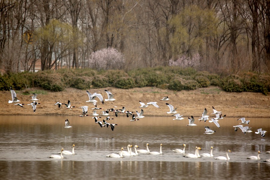 在北京沙河水域拍摄的群鸟翔集的场面(2021年3月17日摄)。新华社发