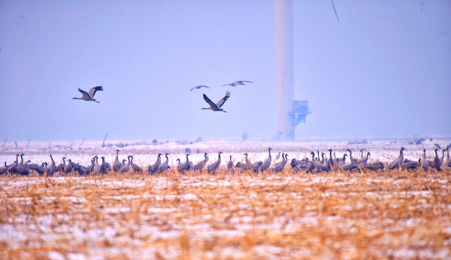 北京野鸭湖湿地自然保护区迎来大群越冬灰鹤(2022年2月18日摄)。新华社发