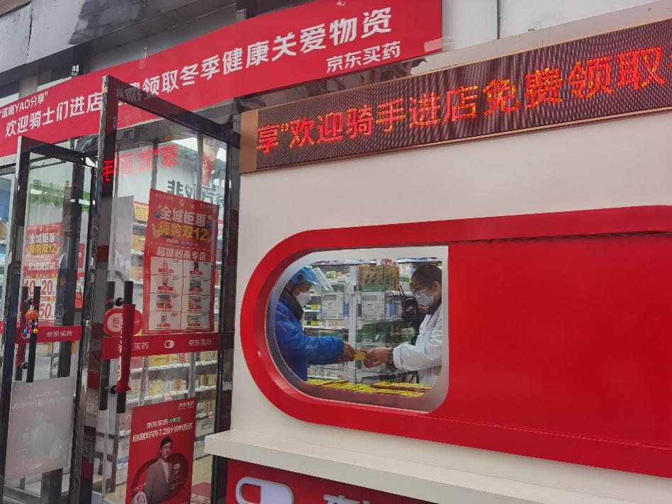 外卖骑手正在京东大药房百子湾店领取暖冬健康物资