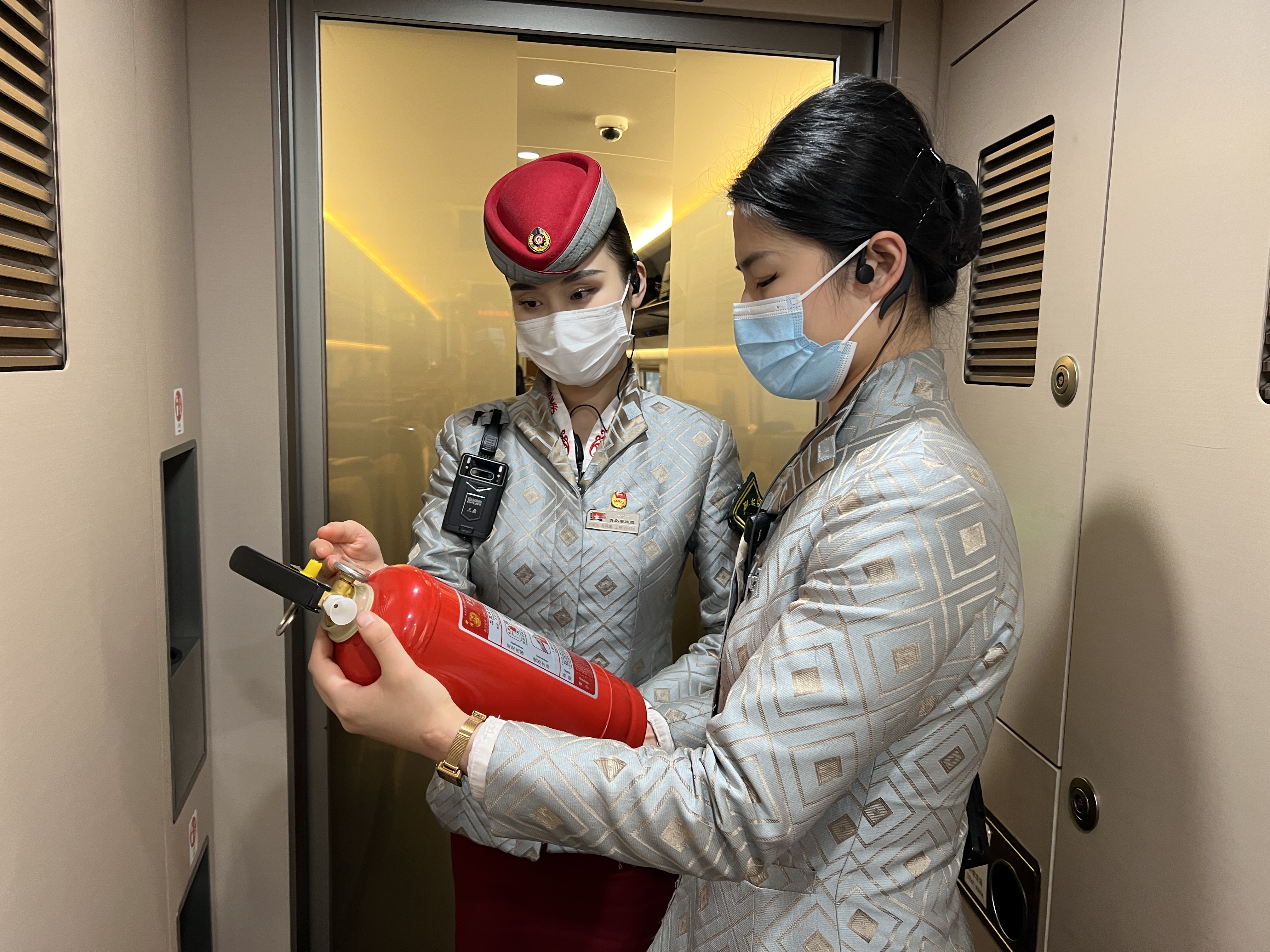 始发前,列车长马晓晴和乘务组全体人员,认真做好列车备品安放、车内橱柜等处所检查、联控对接、仪容仪表等各项始发准备工作,全力以赴用高标准、高质量,做好此趟运输工作。