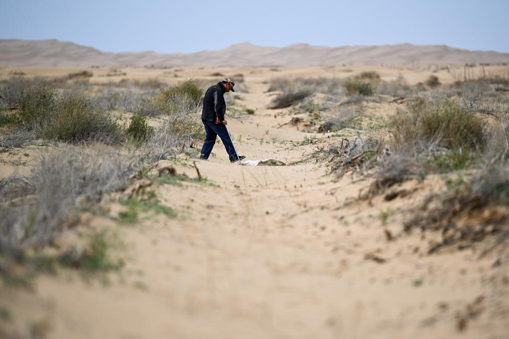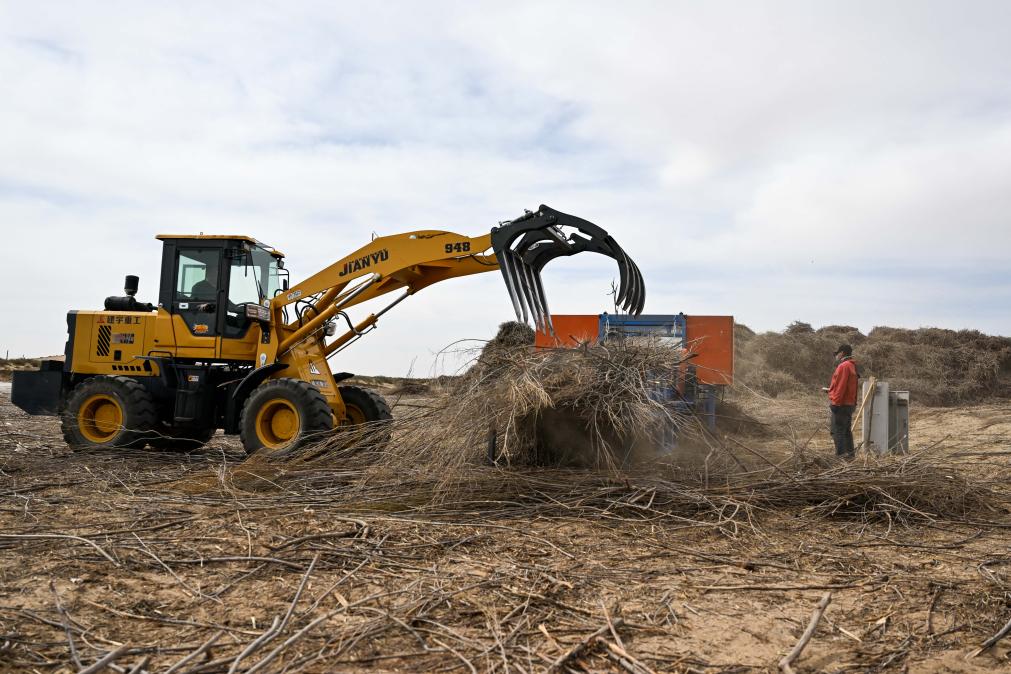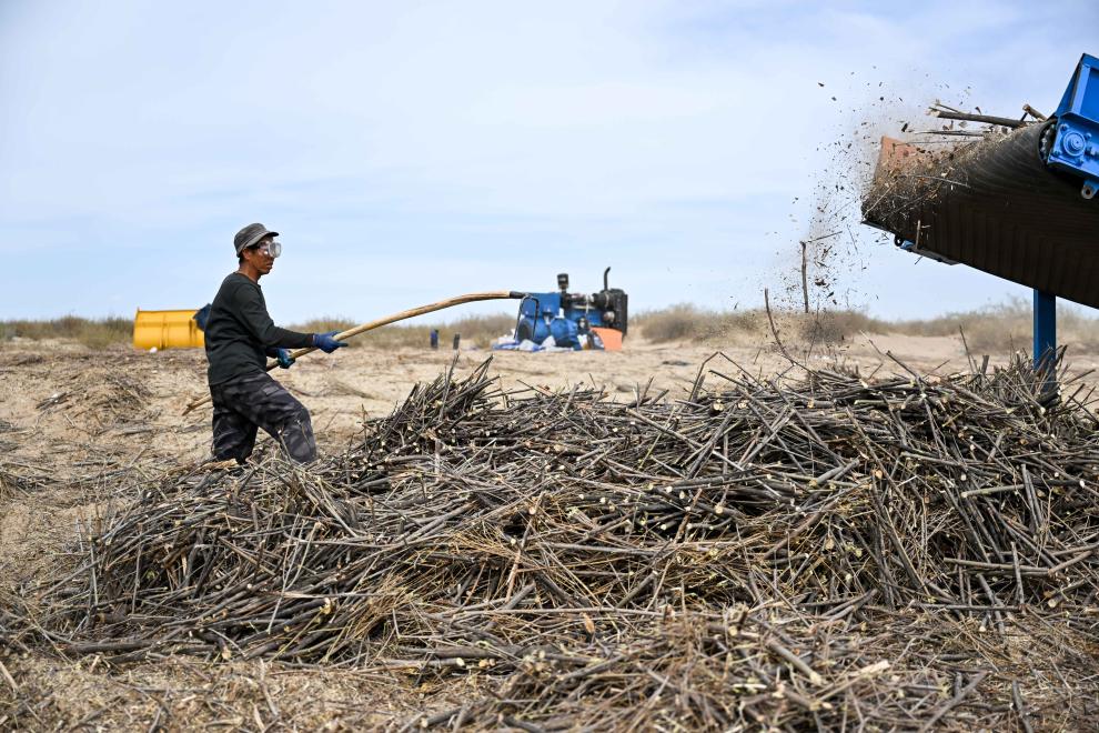 4月28日,在杭锦旗境内的库布其沙漠,治沙工人在平整裁剪后的沙柳。
