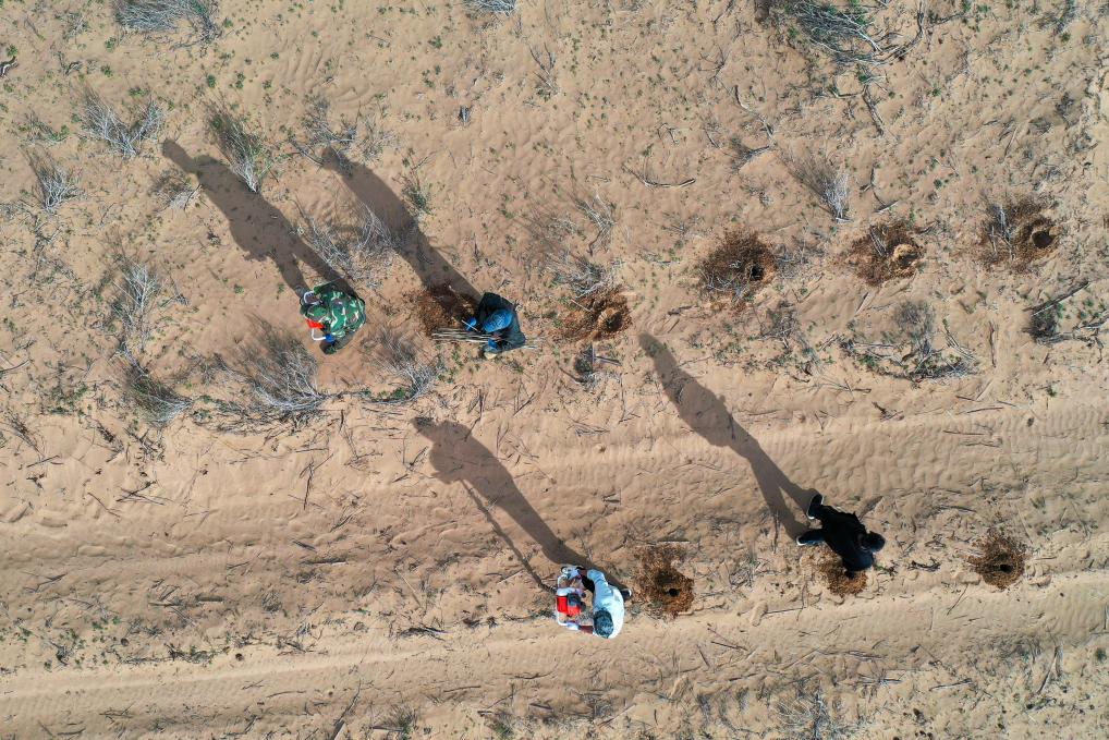 4月28日,在杭锦旗境内的库布其沙漠,治沙工人在栽种沙柳(无人机照片)。