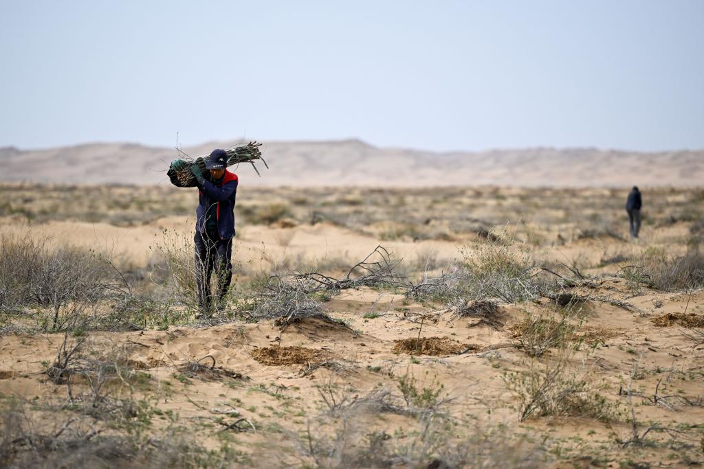 4月28日,在杭锦旗境内的库布其沙漠,治沙工人在搬运沙柳。