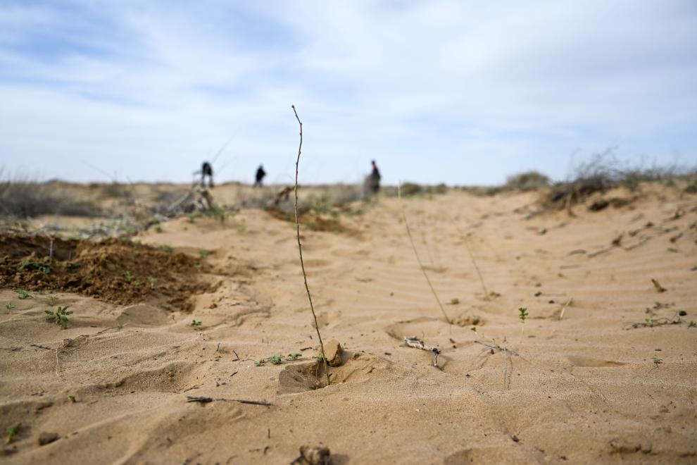 4月28日,在杭锦旗境内的库布其沙漠,治沙工人在栽种沙柳。