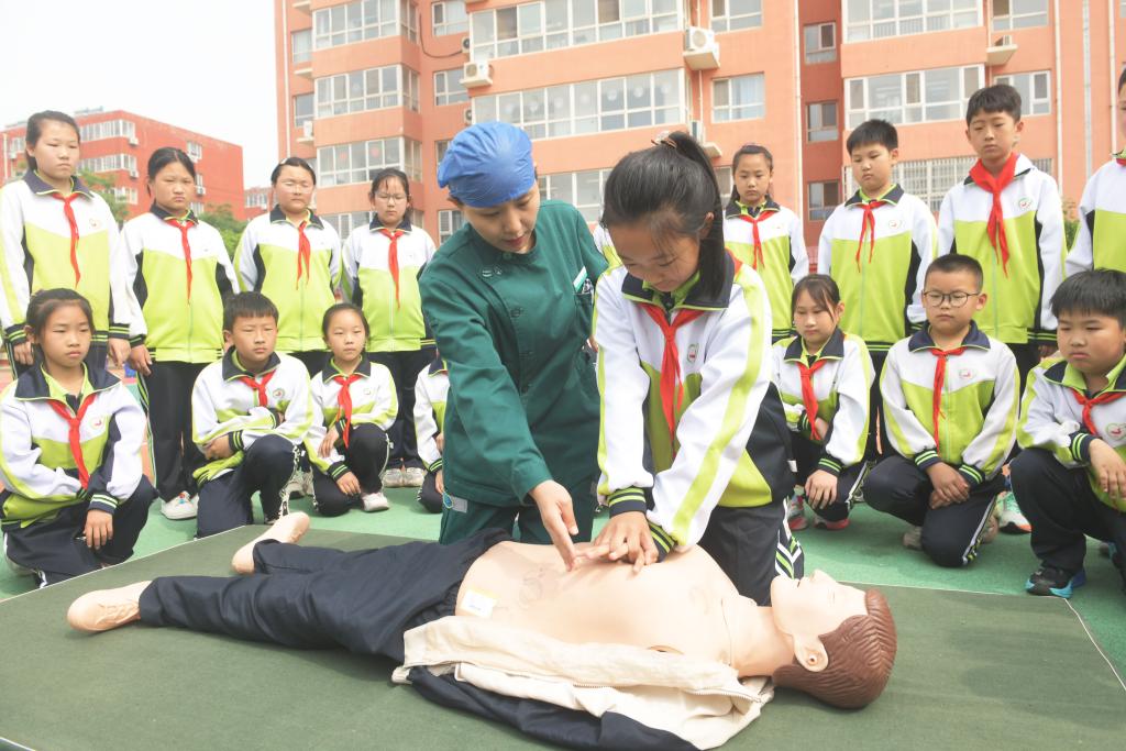5月8日,河北省石家庄市南马路小学的学生在医务人员指导下学习心肺复苏知识。