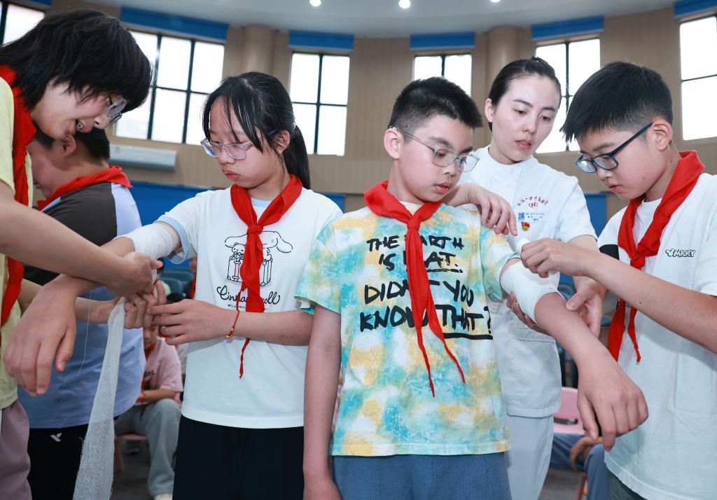 5月8日,在武汉市未来实验小学美林校区,武汉大学中南医院医务人员向小学生讲解急救包扎知识。