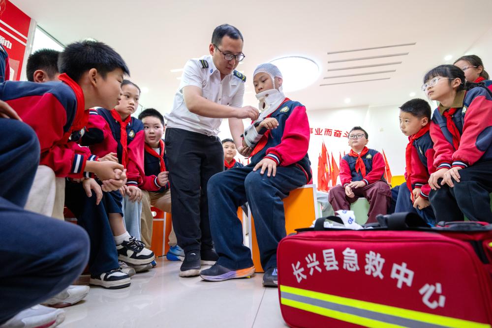 5月8日,浙江省湖州市长兴县急救中心红十字工作者在长兴县第二实验小学为学生演示创伤救护。
