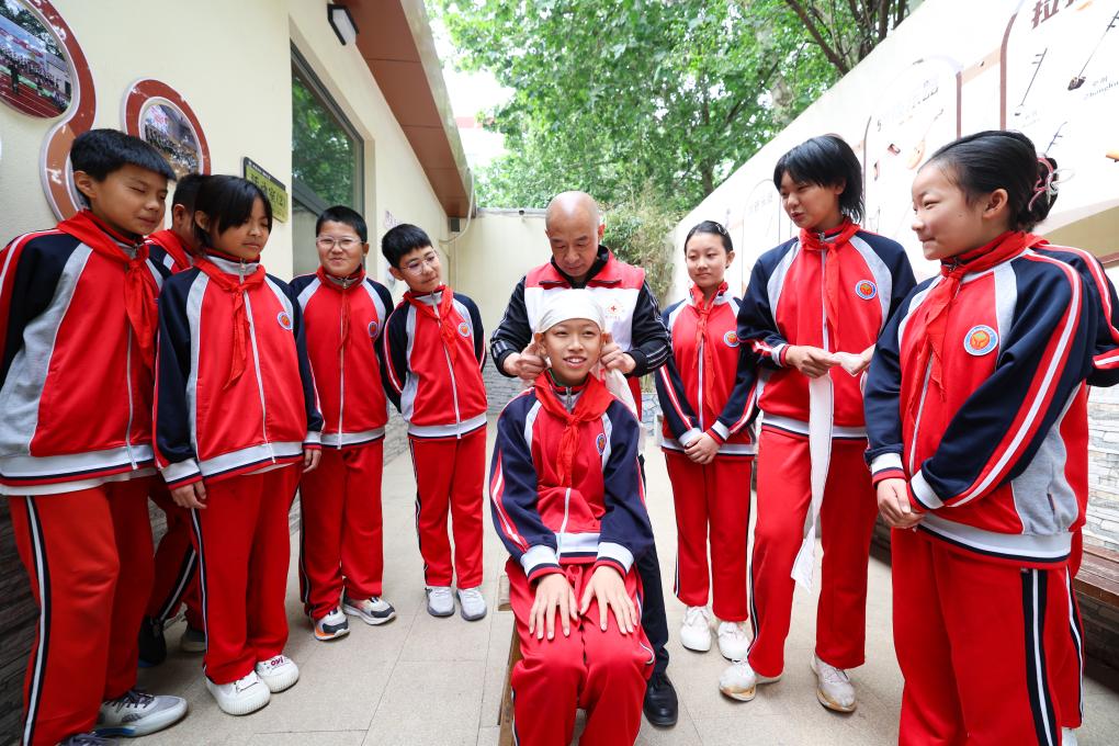 5月8日,在山东省烟台市福山区芝阳山学校,红十字志愿者指导学生练习海姆立克急救法。