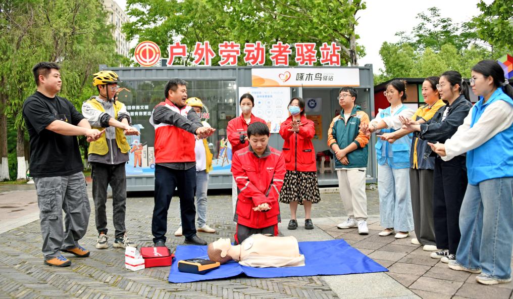 5月8日,在浙江省台州市仙居县市民公园户外劳动者驿站,红十字会志愿者教外卖骑手学习心肺复苏技能。