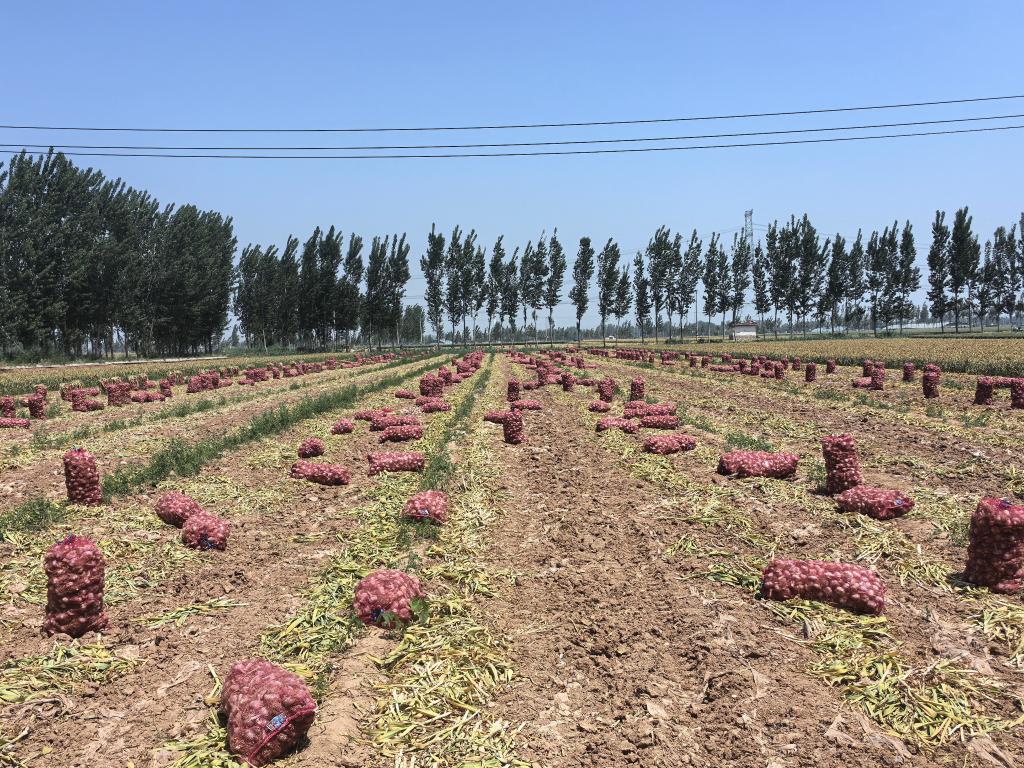 眼下正值大蒜收获期,在山东省济南市商河县白桥镇的连片蒜田里,蒜农们正忙着采收大蒜,一袋袋鲜蒜等待装车。