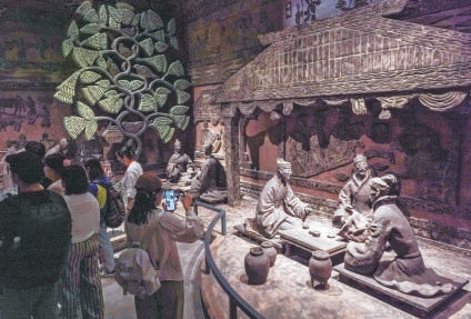 在路县故城遗址博物馆展厅内,汉代饮宴场景吸引参观者驻足。 本报记者 武亦彬摄