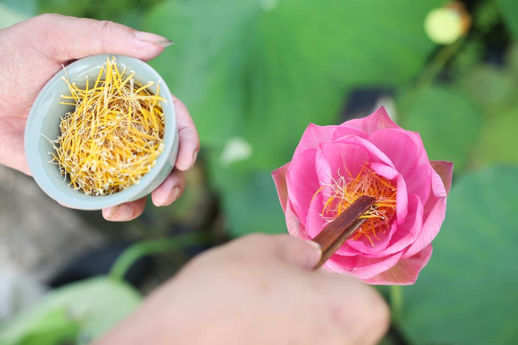 6月18日,武义县柳城镇十里荷花共富工坊工作人员在给荷花进行人工授粉,以培育新品种。