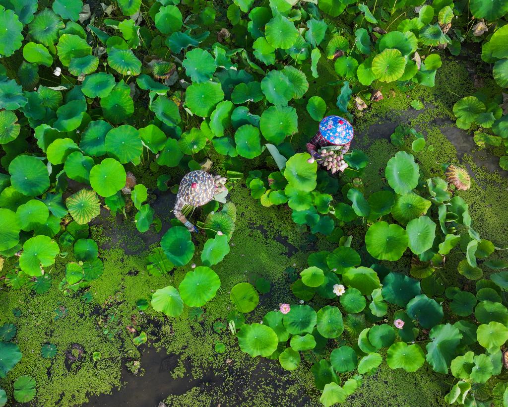 6月18日,武义县柳城镇十里荷花共富工坊的农户在采摘荷花(无人机照片)。