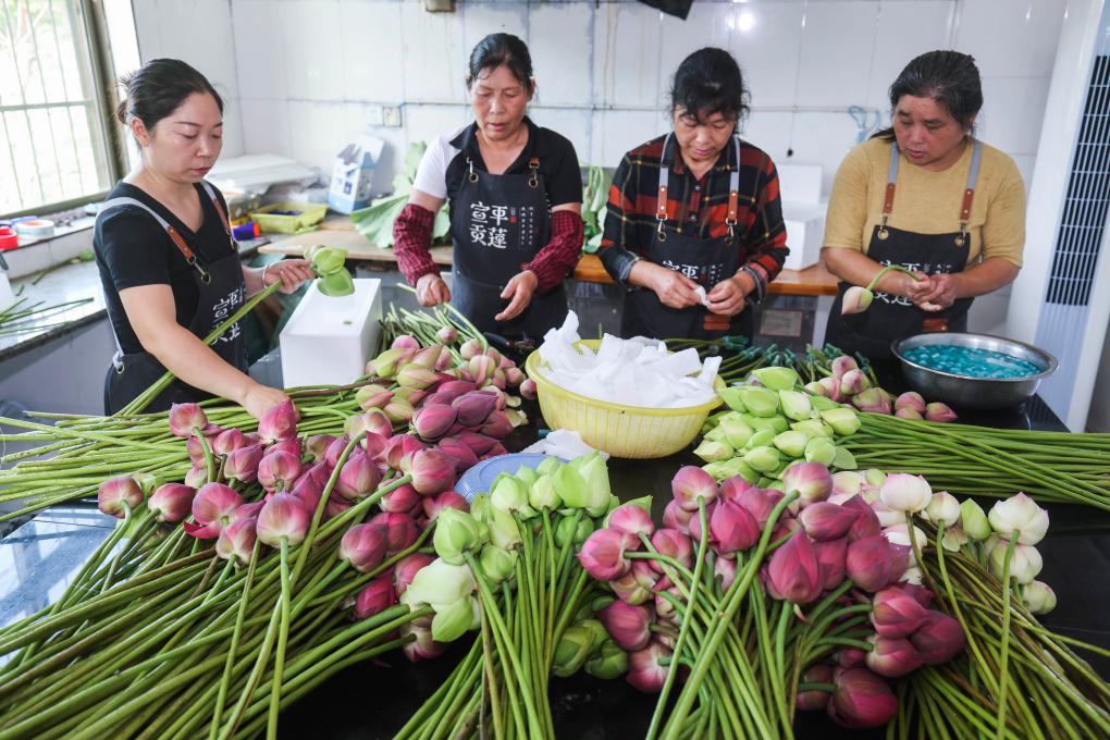 6月18日,武义县柳城镇十里荷花共富工坊的农户在采摘荷花,荷花经过修剪、打包后将发往外地市场。