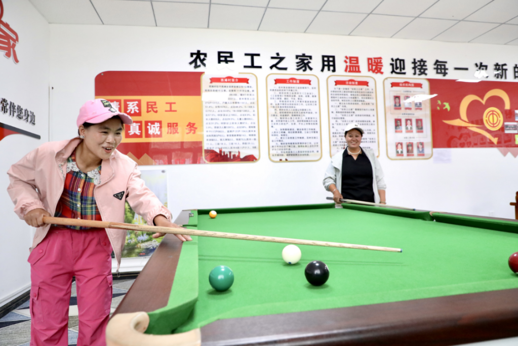 “走,到农民工之家耍去。”炎炎夏日,相约到农民工之家“潇洒挥杆”成了宁夏固原市西吉县西滩乡西滩村群众的一大乐事。从连台球杆都不知道怎么拿,到能熟练将球打出直线“进洞”,31岁的村民马俊梅只用了不到一周时间。她说:“以前夏天可是难熬,现在到农民工之家既能避暑还能打球,美得很。”
