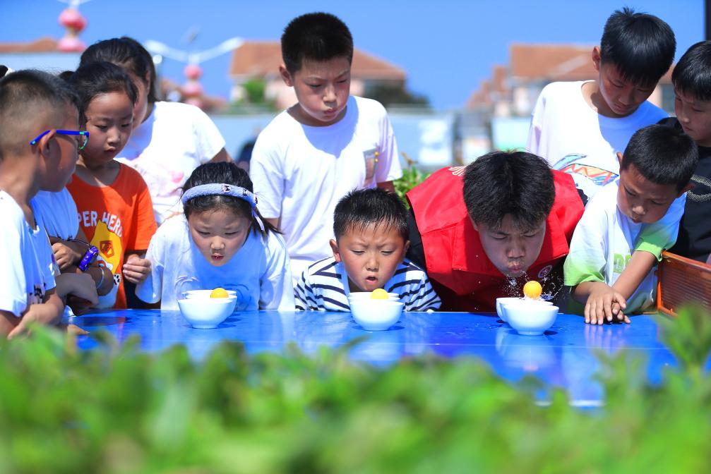 7月20日,在青岛市即墨区龙山街道前东葛村新时代文明实践站,大学生志愿者与孩子们一起玩“碗里传球”游戏。