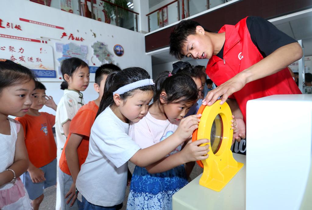 7月20日,在青岛市即墨区龙山街道前东葛村新时代文明实践站,大学生志愿者带孩子们体验科普装置。
