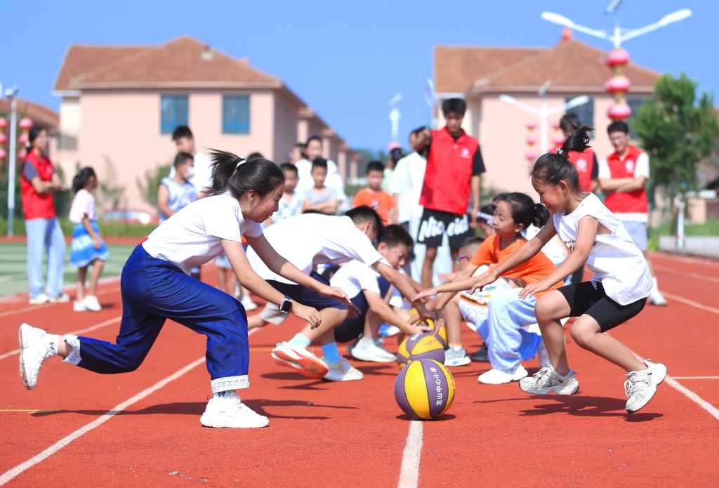 7月20日,在青岛市即墨区龙山街道前东葛村新时代文明实践站,大学生志愿者与孩子们一起玩“听口令、抢篮球”游戏。