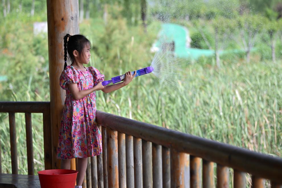 7月22日,小朋友在天津市西青区王稳庄镇生态绿廊玩耍。