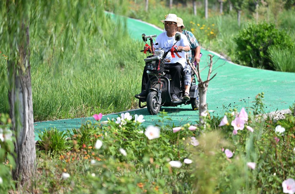 7月22日,人们在天津市西青区王稳庄镇生态绿廊游玩。