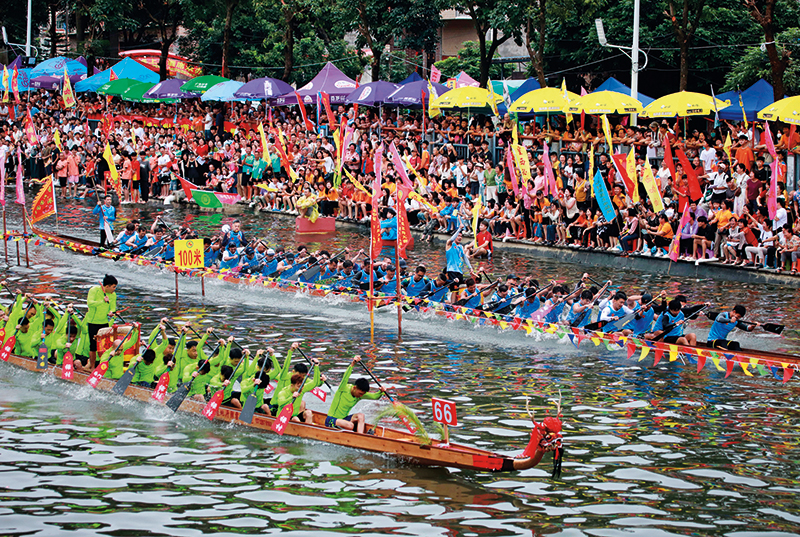 而当荔枝挂红、粽叶飘香的时节到来,水网密布的广东开始出现另一幅激动人心的画面。“龙船扒得快,今年好世界”——江河湖海一艘艘色彩斑斓、造型威武的龙舟闪亮登场,桨手奋楫击鼓,河岸上鞭炮声、喝彩声震耳欲聋。