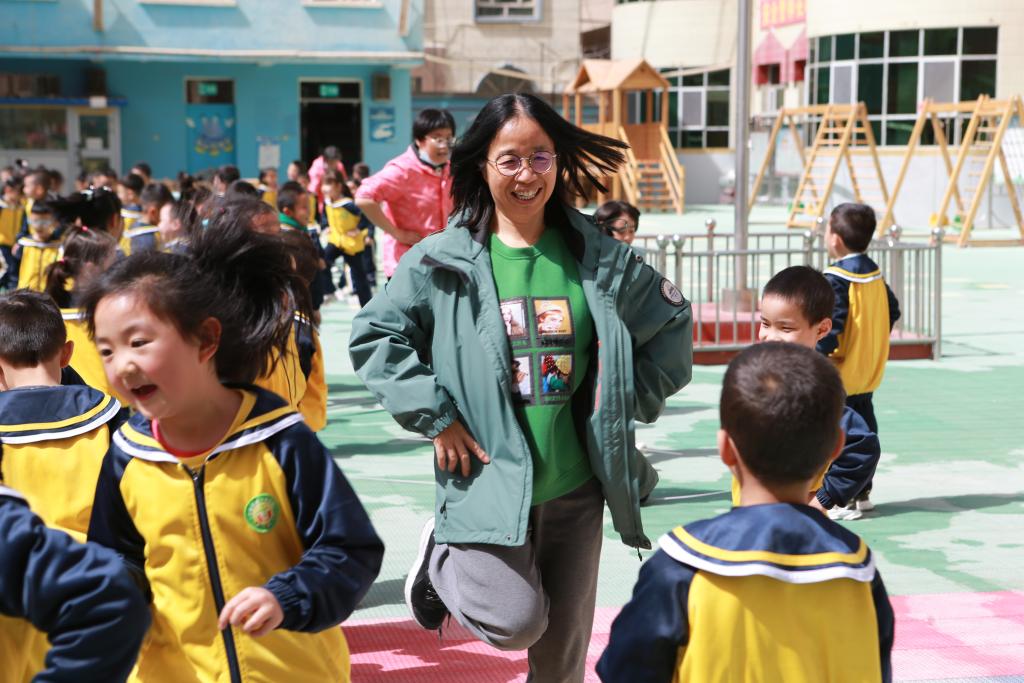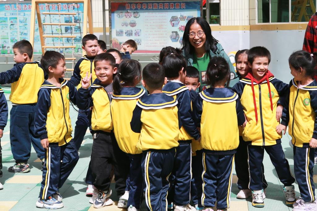 在对口援疆关爱活动中,王芳与新疆喀什地区的孩子互动(2024年3月29日摄)。 “作为女性,我很幸运有自由的选择、幸福稳定的家庭。我希望可以为更多的孩子、妇女和家庭做我力所能及的事情。”王芳说。