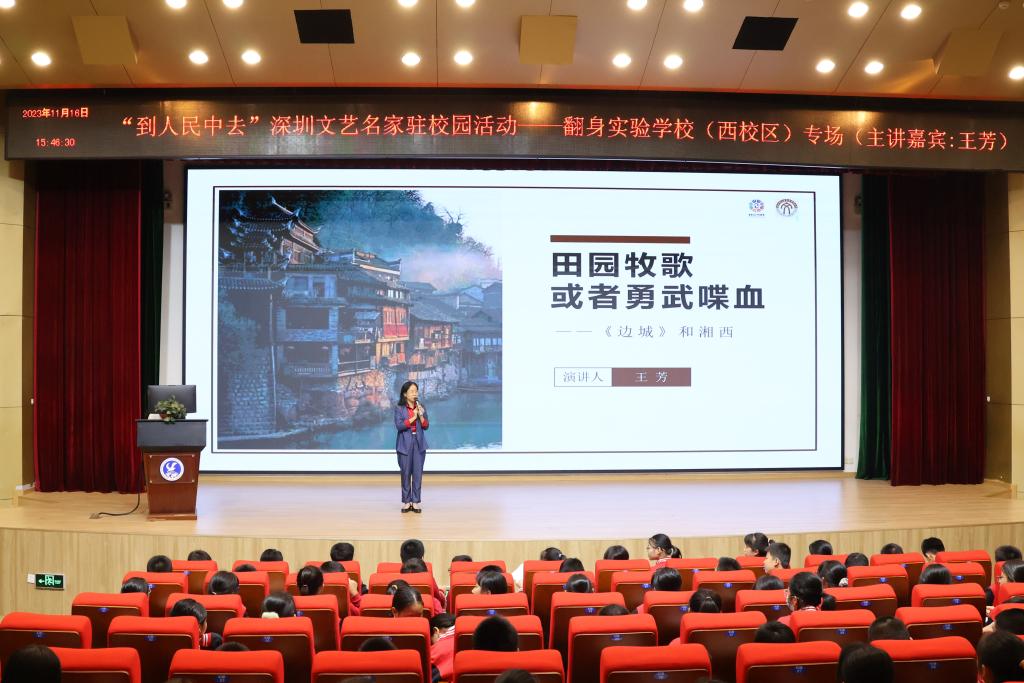 在深圳文艺名家驻校园活动中,王芳为翻身实验学校的孩子讲解文学作品(2023年11月16日摄)。