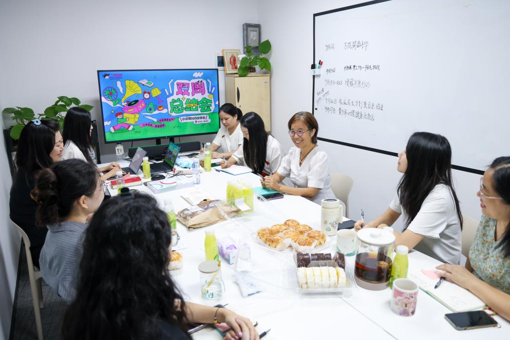 在位于深圳妇儿大厦的深圳市妇女儿童发展基金会办公室,王芳(右二)和基金会工作人员开会讨论公益项目(2025年9月26日摄)。“儿童友好型城市”