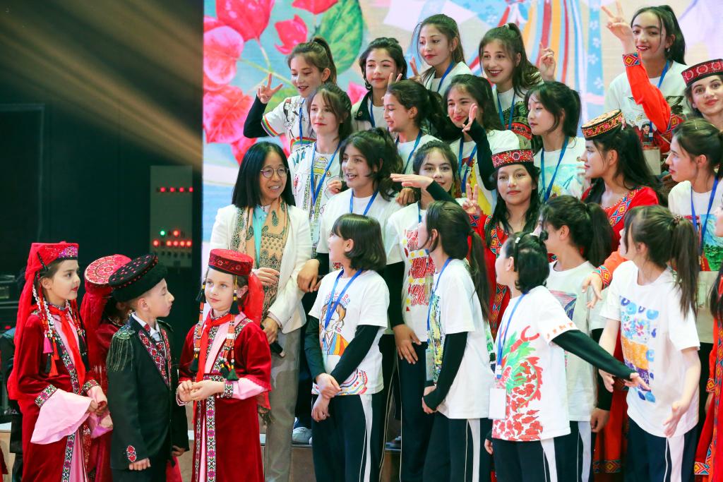 在新疆喀什大学举办的“深喀同心 春暖花开”公益音乐会后,王芳(左五)与参加活动的合唱团成员交流(2024年4月2日摄)。在儿童工作中