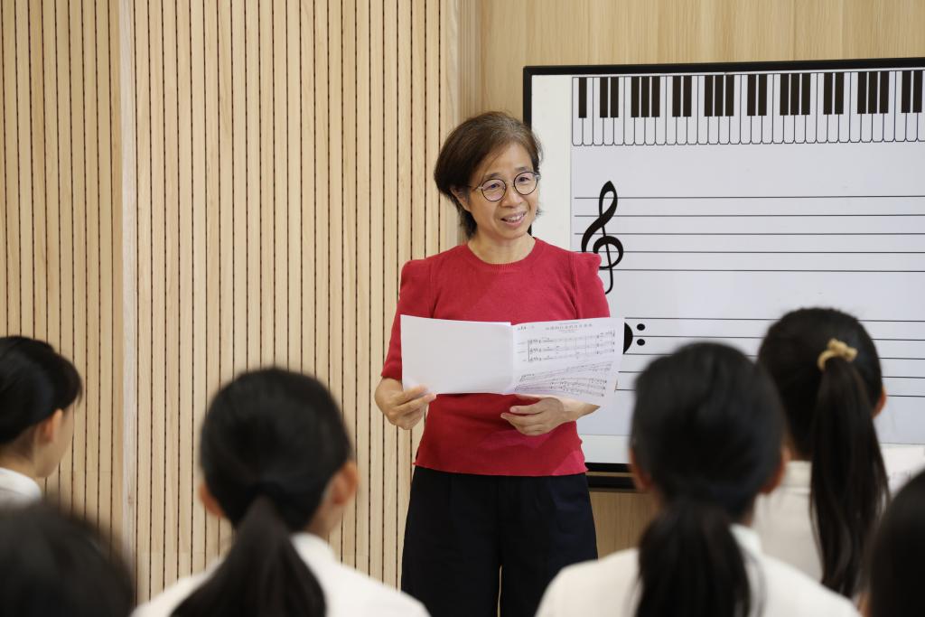 在深圳妇儿大厦的排练室内,王芳(右一)为飞越彩虹多民族童声合唱团的孩子讲解歌词(2025年10月8日摄)。毕业于北京大学中文系的王芳