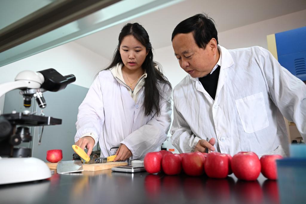 10月21日,西北农林科技大学白水苹果试验站站长高华(右)和硕士研究生于萌检测苹果糖度。
