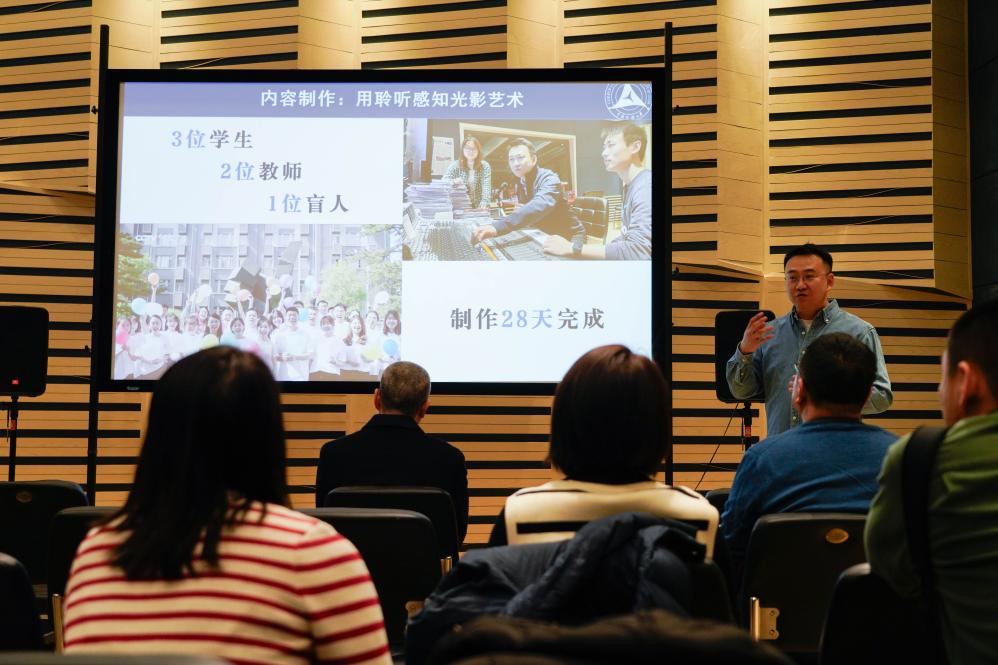 教师志愿者付海钲在中国传媒大学“光明影院”无障碍信息传播实验室为媒体介绍光明影院项目(12月1日摄)。