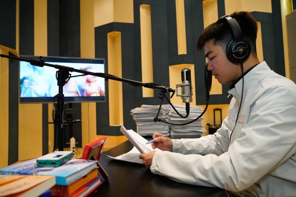 “光明影院”志愿者在进行无障碍电影讲述配音(12月1日摄)。