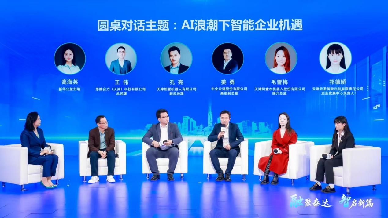 在“AI浪潮下高成长性企业机遇”圆桌对话中,思腾合力(天津)科技有限公司、天津朗誉机器人有限公司、中企云链股份有限公司、天津阿童木机器人股份有限公司、天津云圣智能科技有限责任公司等企业代表畅所欲言,就人工智能领域的创新实践、区域营商环境、抢抓AI未来机遇等话题进行了深入探讨,展现了经开区活跃的产业生态与蓬勃的创新活力。