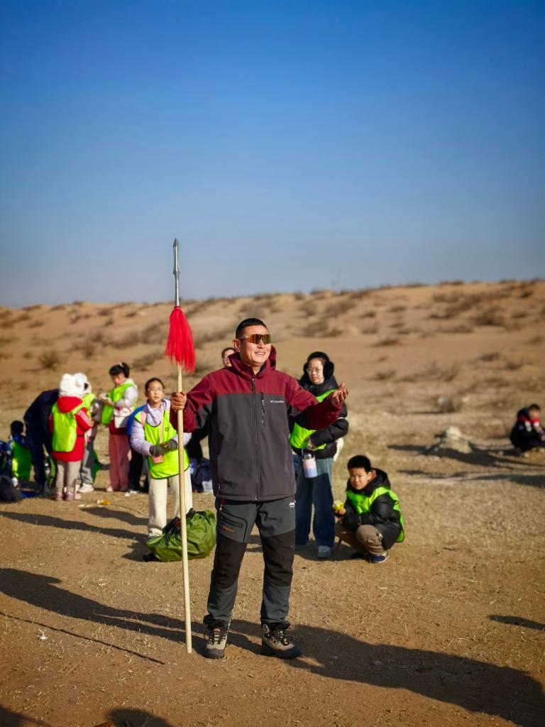 站在长城脚下,他和孩子们齐诵边塞诗句“大漠孤烟直,长河落日圆”;远望长城雄姿,他带大家体验夯土筑墙,感受长城建造的古老智慧;置身荒漠之间,他教孩子们围草固沙,体会先辈守护家园的担当。