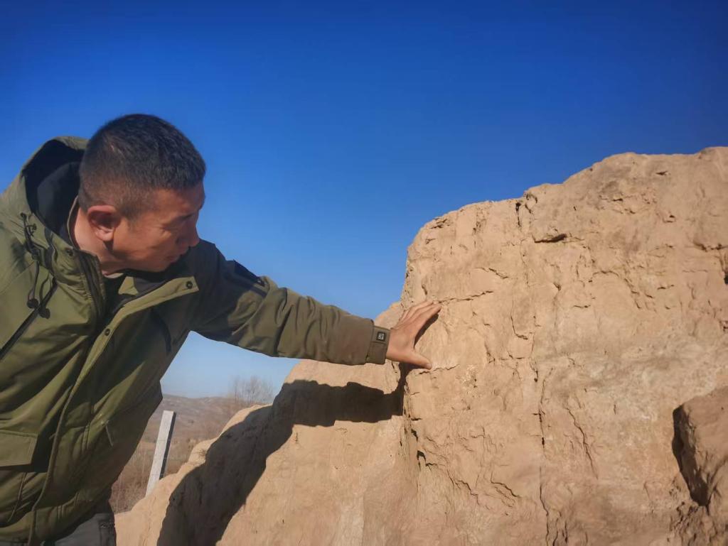 他沿着夯土墙体缓步前行,不时俯身,用工兵铲轻拢自然风化形成的裂隙、小动物洞穴周边的散土,对重点巡查点位拍摄记录。