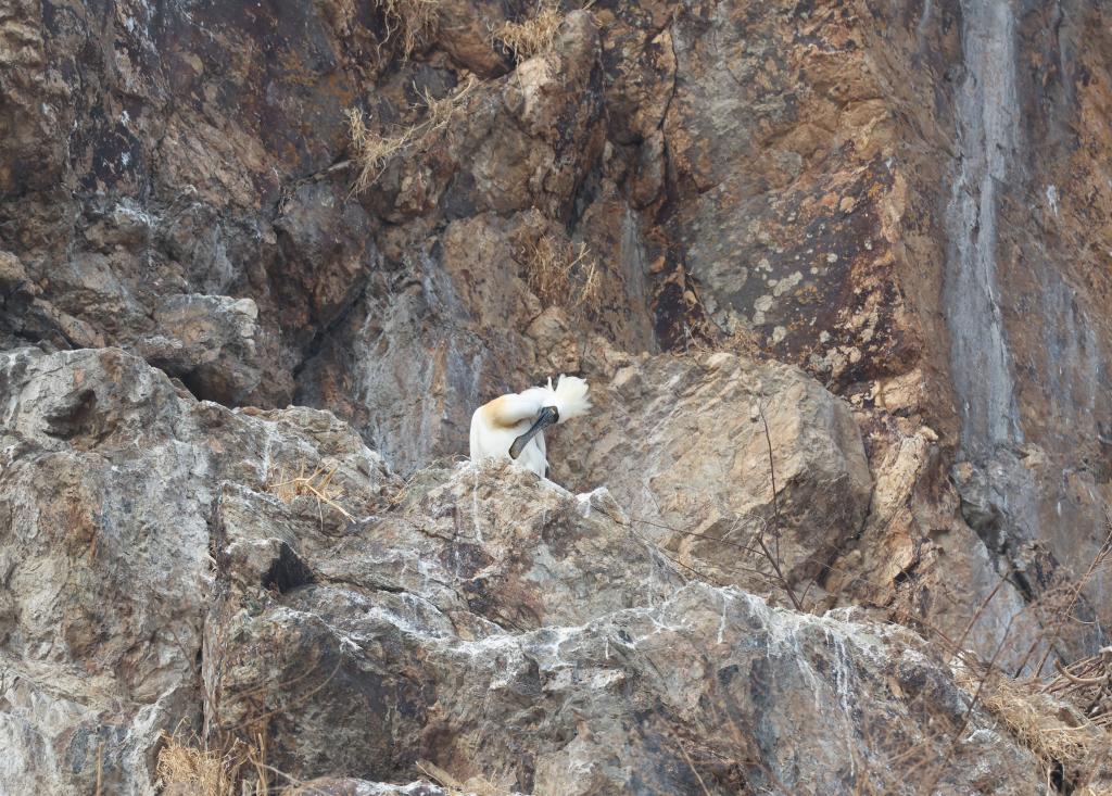 4月14日,辽宁省庄河市石城乡形人坨,黑脸琵鹭在崖壁上梳理羽毛。