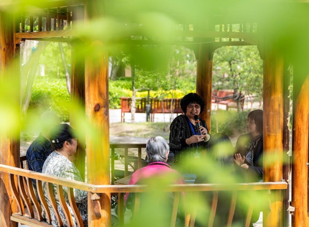 4月23日,在天津市滨海新区第一老年养护院,老人们围坐一起表演节目。